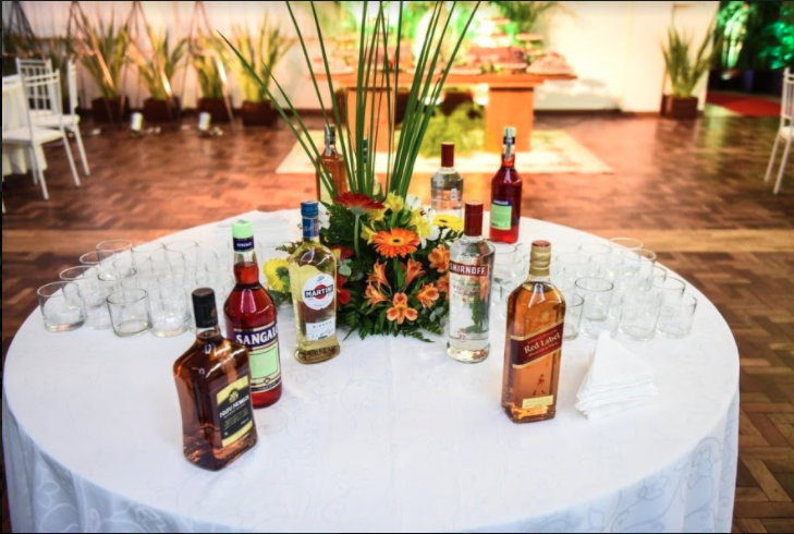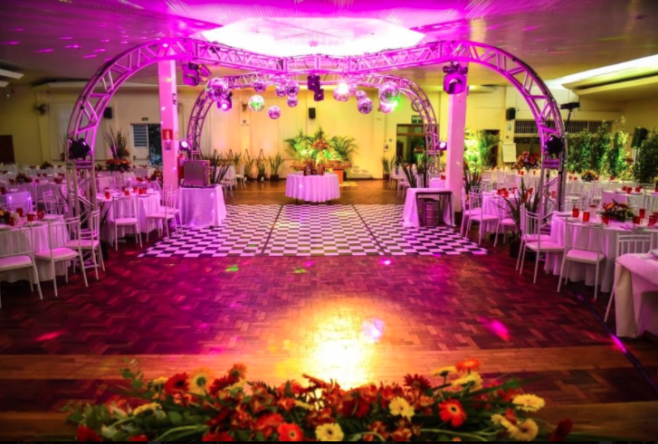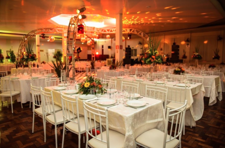 Decoração do salão com mesas de 10 á 12 lugares, decoradas com arranjo baixos redondos com gérberas laranjas, vermelhas e amarelas, astromélias vermelhas e verdes.