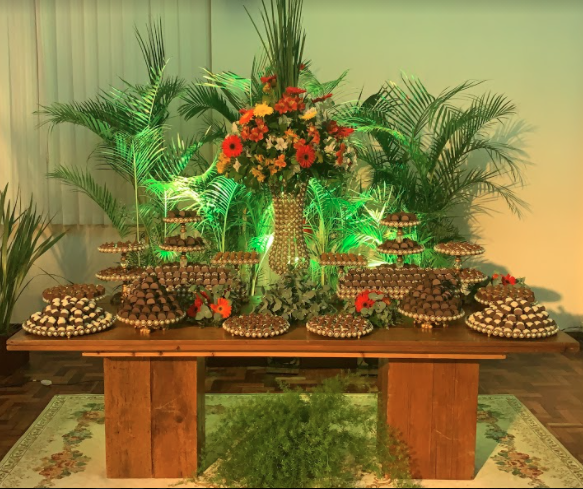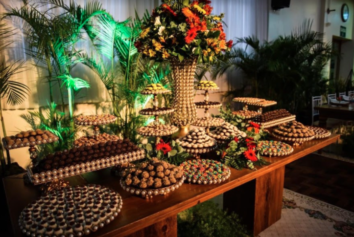 Mesa de doces decorada com um arranjo redondo alto em tulipa com detalhes em pedras, com gérberas laranjas, vermelhas e amarelas, astromélias vermelhas e verdes.
