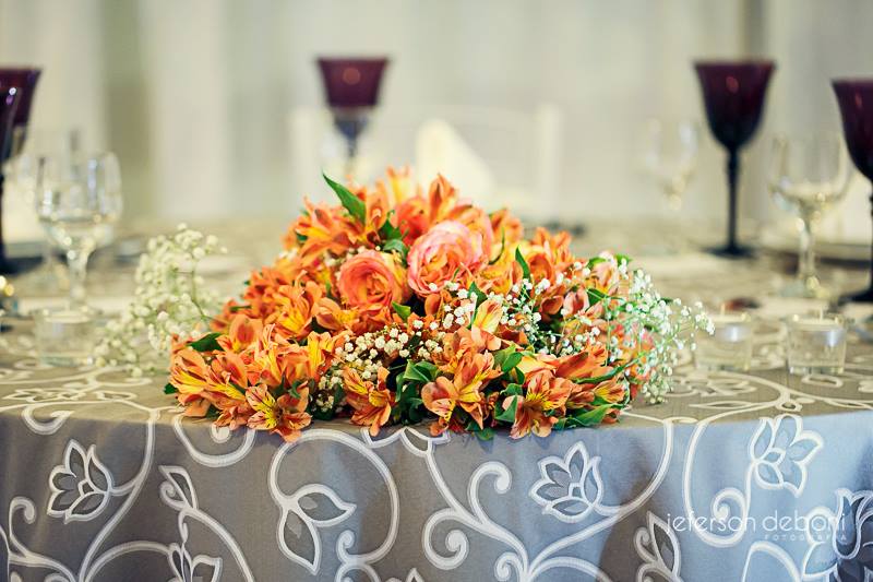 Decoração na mesa dos convidados com arranjo redondo em tons de laranja, com rosas corais, astromélias laranjas. mosquitinhos e verdes.