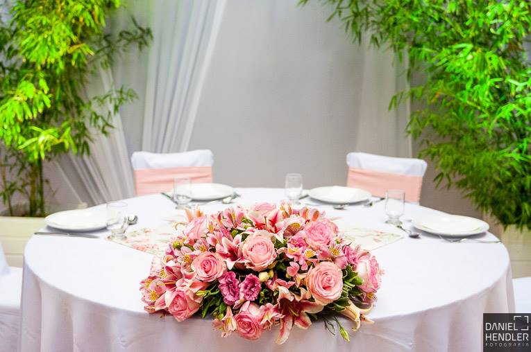 Decoração em mesa do(s) formando(s) com arranjo redondo em tons de cor de rosa.