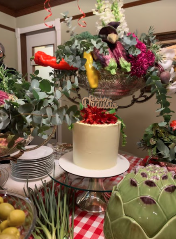 Jantar temático decorado com beringelas, pimentões e verdes, arranjos baixos e suspensos. Detalhe no topo do bolo com astromélias roxas.