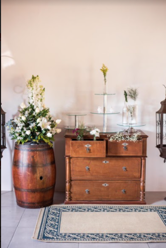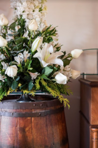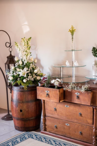 Mesa de doces decorada com um arranjo baixo, apoiado em um barril de madeira, com lírios, rosas nacionais, astromélias e boca de leão brancas, com ruscus e verdes. Mais alguns galhos de mosquitinhos e ruscus, em vasos solitários.