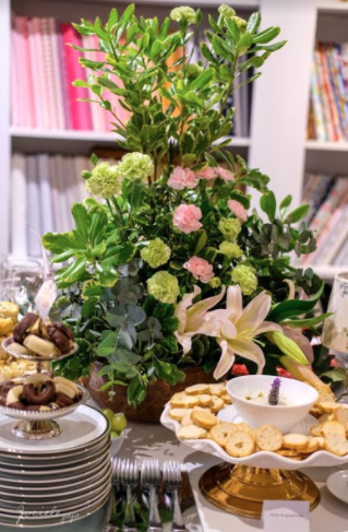 Mesa decorada com arranjo grande pirâmidal com lírios e rosas cor de rosas, pom-pons verdes e folhas verdes.