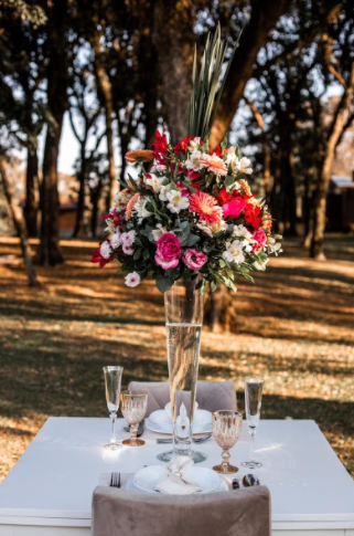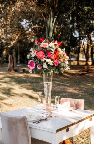 Mesa de jantar decorada com arranjo redondo, apoiado em tulipa transparente com água, composto por gérberas de diferentes tons de rosa, astromélias brancas, rosas importadas cor de rosa e verdes.