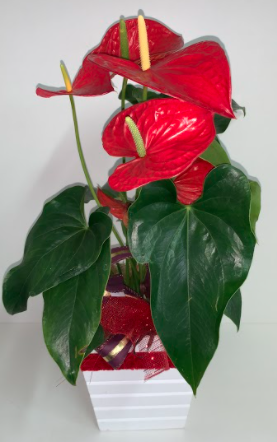 Antúrio vermelho em cachepó de madeira branco.