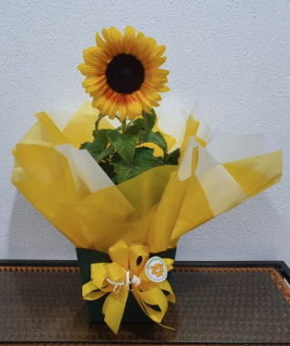 Girassóis plantados em diferentes embalagens.