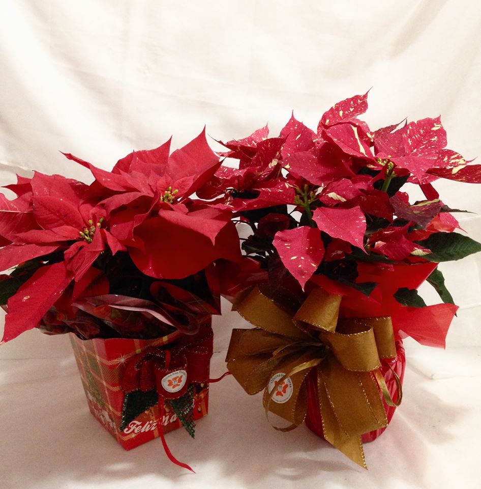 Poisetes ou flores do natal, enfeitadas em caixas de papel temáicas.