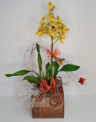 Orquídea amarela de uma aste, enfeitada em cachepó de madeira.