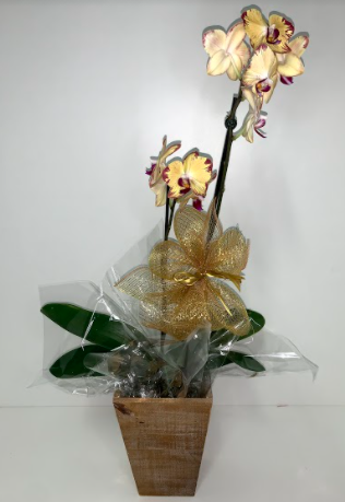 Orquídea de dois gallhos amarela com detalhes em roxo, enfeitada em cachepó de madeira.