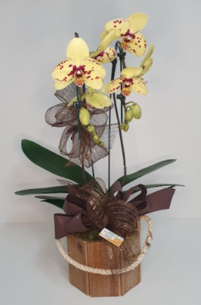 Orquidea com duas astes marelas, média decorada em cachepó de madeira.