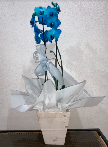 Orquídea de duas astes azul, enfeitada em cachepó de madeira branco.