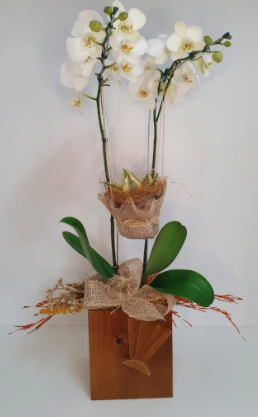 Orquidea de duas astes brancas, enfeitada em cachepó de madeira quadrado.