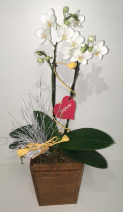 Orquidea média de duas astes brancas, enfeitada em cachepó de madeira.