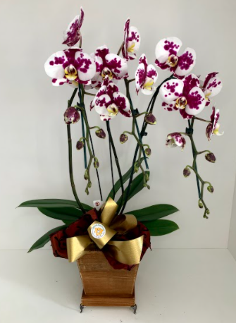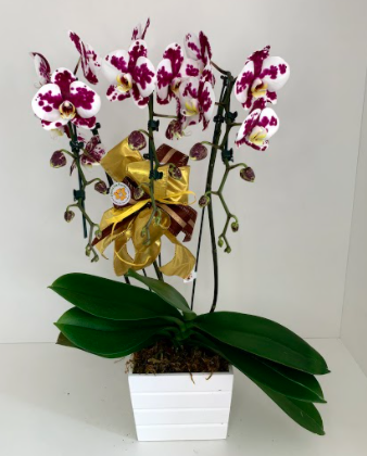 Orquídeas com duas astes brancas com roxo grandes, enfeitadas em cahcepós de madeira quadrados.