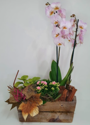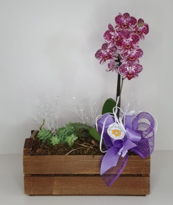Orquídeas de uma aste na cor lilás, representadas em modelos diferenciados de cachepós de madeira. Planta agrupada juntamente com outras como suculentas e mini calandivas.