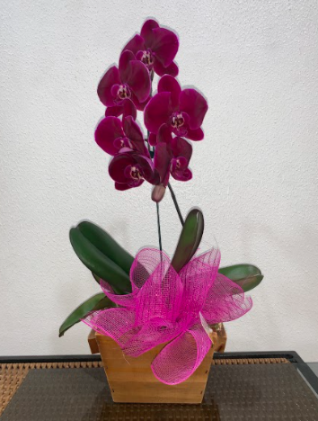 Orquídea de uma aste roxo escuro, enfeitada em cachepó de madeira quadrado.