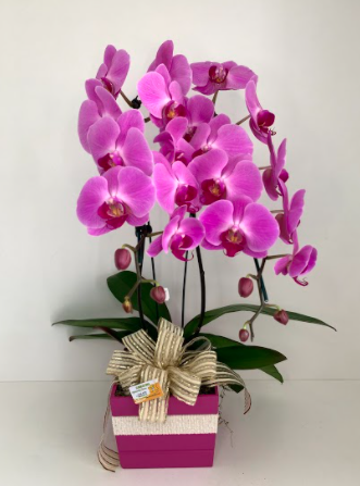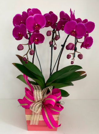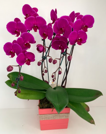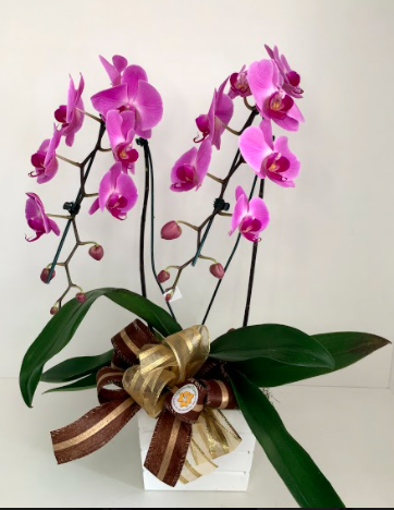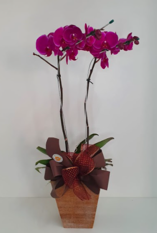 Orquídeas de duas astes roxos escuro, enfeitadas em cachepós de madeira quadrados.