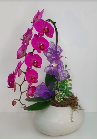 Orquídea de uma aste roxa grande, enfeitada em cachepó redondo.